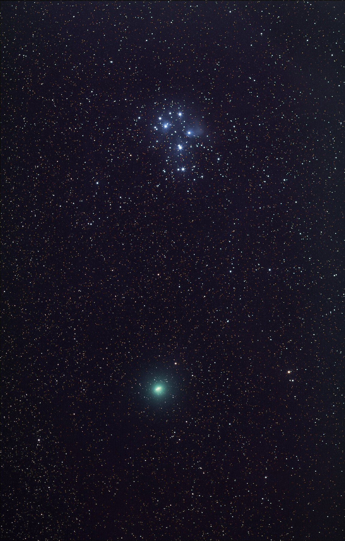 This is my first time imaging a comet through a telescope. What a beautiful comet! Besides imaging and observing it with a telescope, I also viewed it with binoculars. I could detect it naked eye as a smudge to the right of the Pleiades.Flickr
