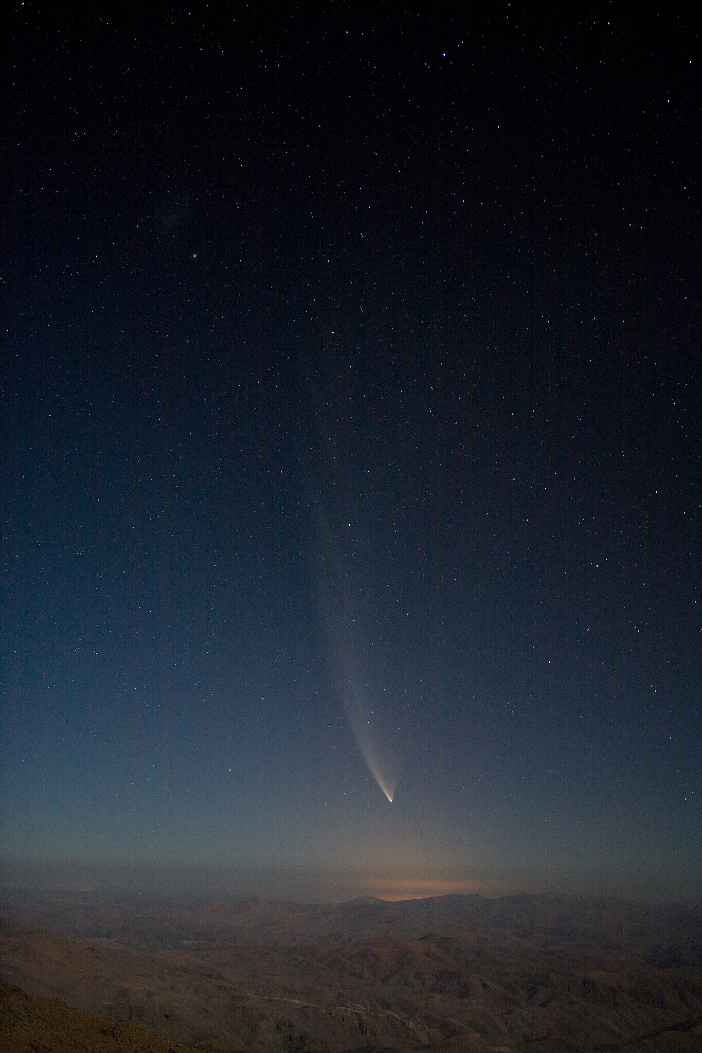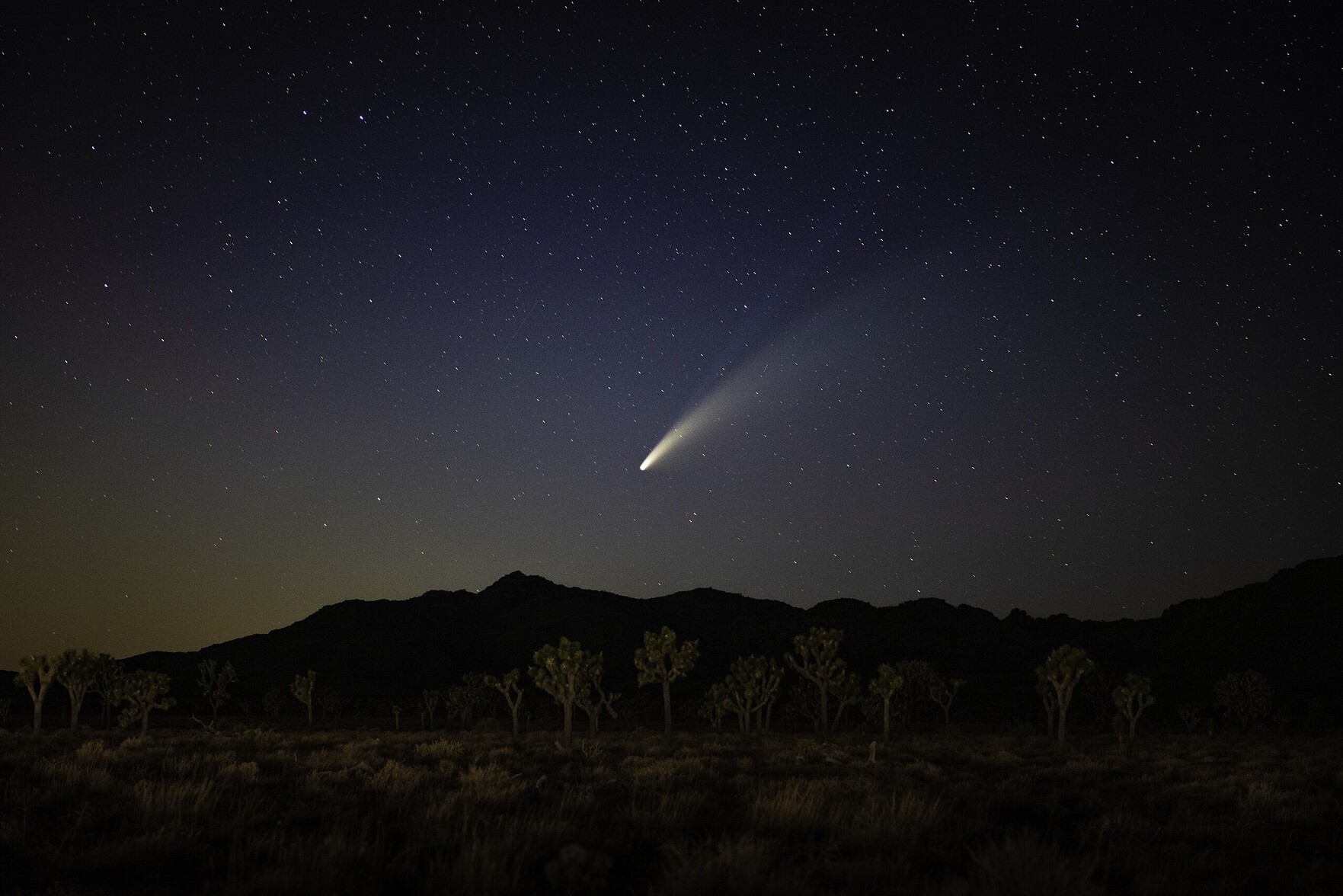 NPS / Emily Hassell Alt text: Comet NEOWISE leaves a bright trail over distant dark mountains and a field of dimly lit Joshua trees.Flickr