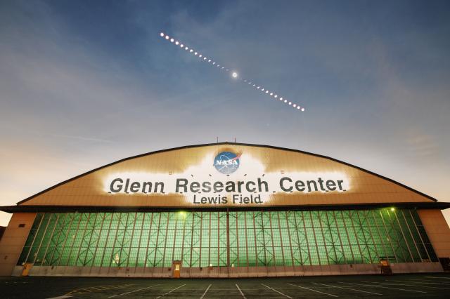 A stunning view of the phases of the total solar eclipse, seen over the Flight Research Building at NASA’s Glenn Research Center in Cleveland on April 8, 2024.Ellen Bausback (NASA)