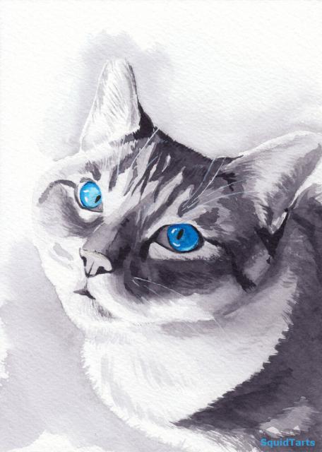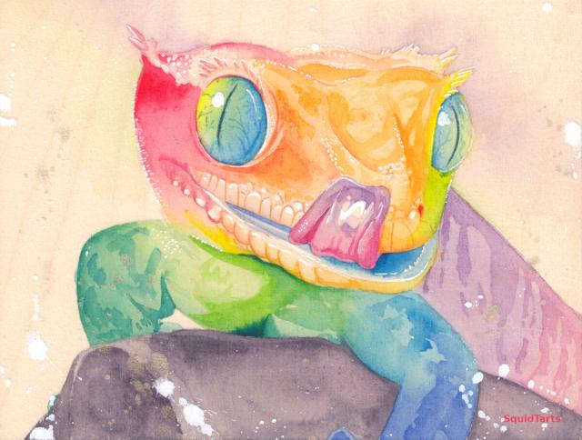 I'm Squid (they/them), a Canadian artist specializing in watercolour and india ink. I paint mostly pet portraits and wildlife art in a rainbow style. I run a sticker and print shop on Etsy and love noodling new, cartoony designs. Cats and reptiles are my jam!