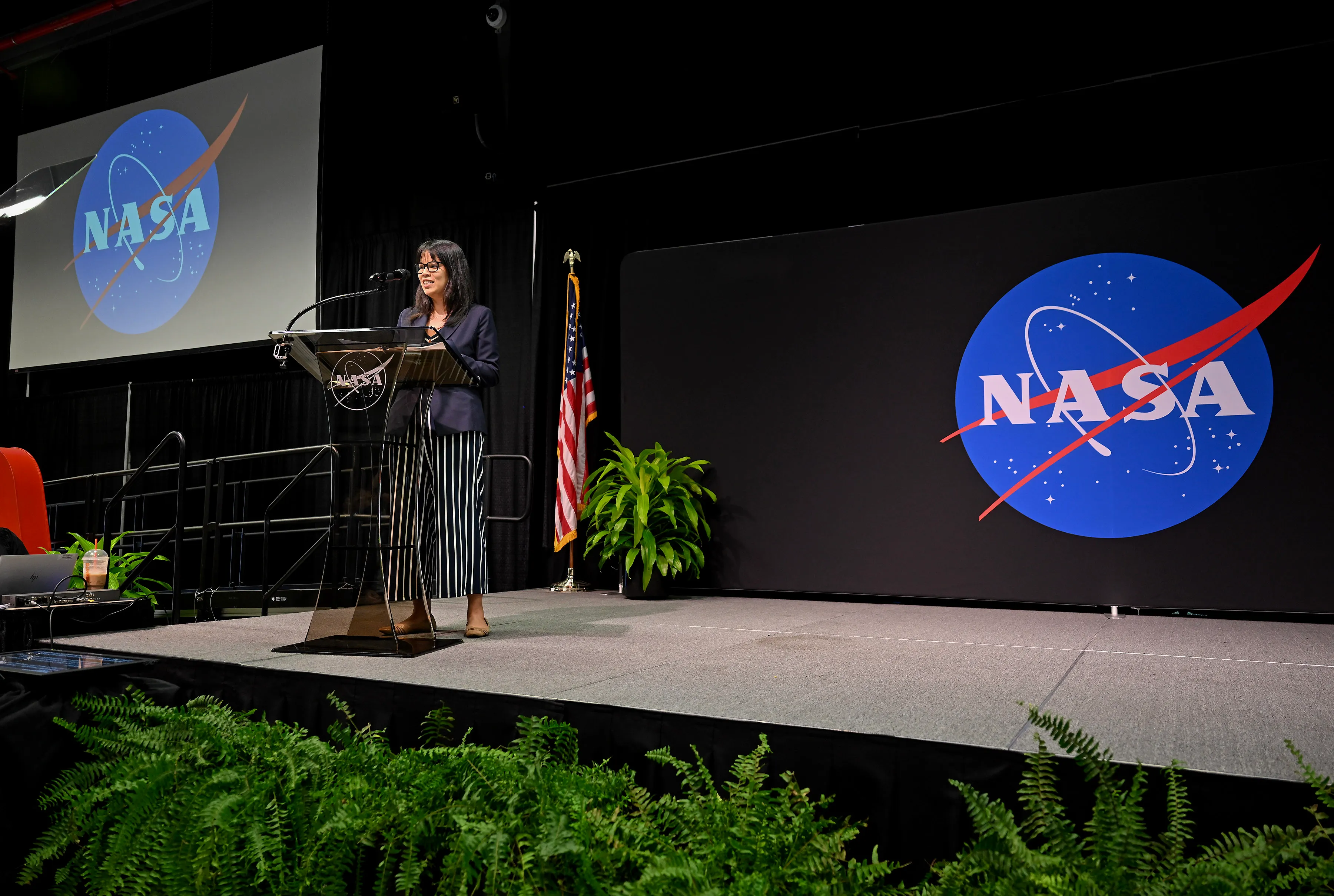 NASA Chief Financial Officer Margaret Vo Schaus speaks to audience members and honorees Aug. 15 during the 2023 Agency/Center Honor Awards at NASA’s MarshallLee Mohon (NASA)