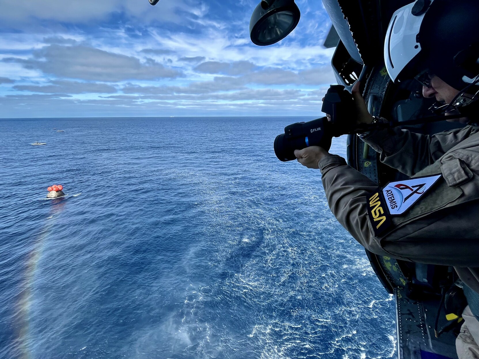 In this image, a member of the recovery team captures imagery of @NASA_Orion shortly after it splashed down in the Pacific Ocean off the coast of Baja California on Dec. 11. The splashdown marked the successful conclusion of the #Artemis I mission.