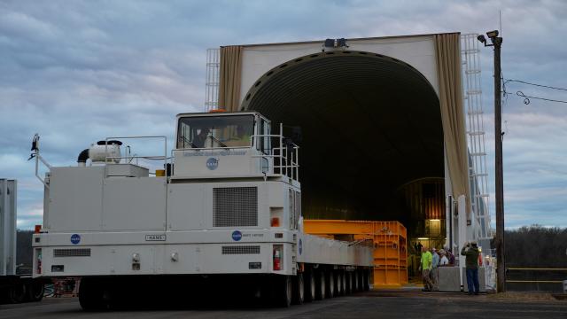 Crews from NASA’s Marshall Space Flight Center in Huntsville, Alabama, offload a transportation stand from NASA’s Pegasus barge Saturday, Jan. 7.Lee Mohon (NASA)