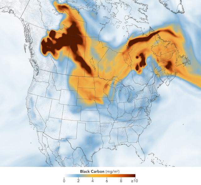 This map shows the density of black carbon particles—or soot—in the smoke, which can be hazardous for human health.