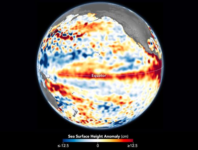 El Niño can be seen in sea surface height, as warmer waters pile up due to weakening trade winds, raising sea level.