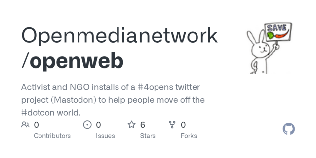Activist and NGO installs of a #4opens twitter project (Mastodon) to help people move off the #dotcon world. - Openmedianetwork/openwebGitHub