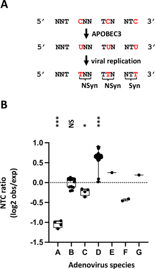 "we show that adenovirus infection leads to a reduction of the quantity and/or enzymatic activity of the APOBEC3B protein depending on the strains. The A12 strain seems less able to resist APOBEC3B than the B3 or C2 strains, a characteristic which could explain the strong depletion of the APOBEC3-targeted motifs in the A12 genome."
