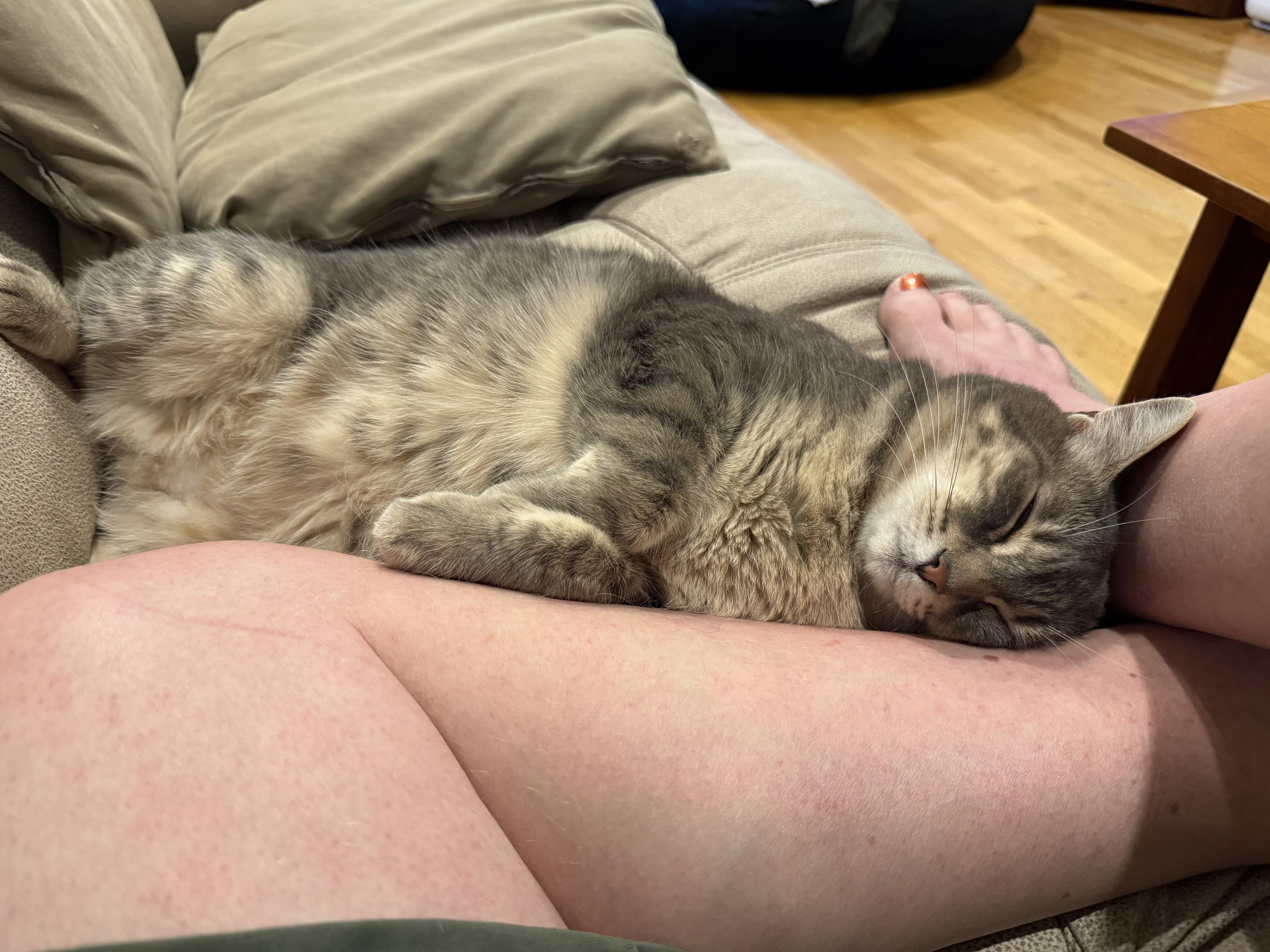 Bella loves to have the inside of her hind legs scratched (look at those air biscuits! π»). Benny loves to use me as a mobile observation platform so he can survey his kingdom.