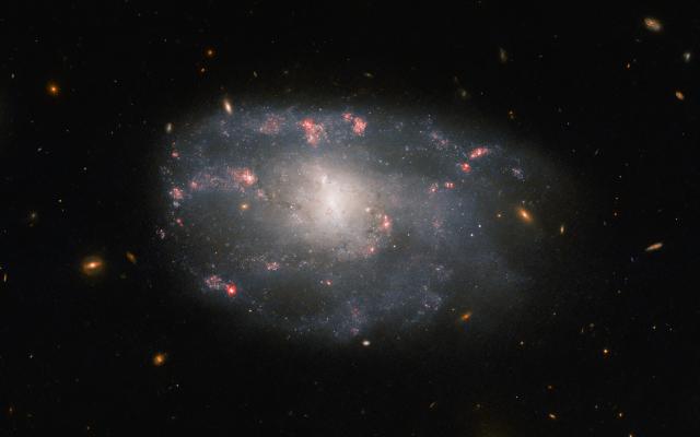 The irregular spiral galaxy NGC 5486 hangs against a background of dim, distant galaxies in this image from the NASA/ESA Hubble Space Telescope.Andrea Gianopoulos (NASA)