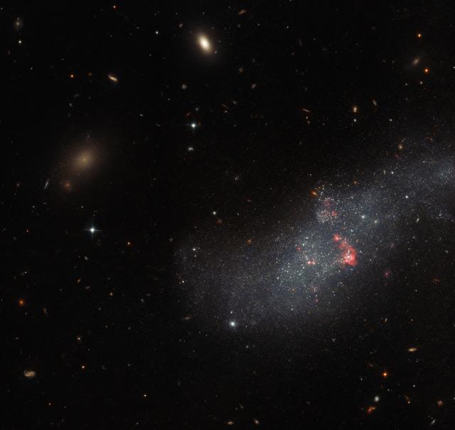 UGCA 307 hangs against an irregular backdrop of distant galaxies in this image from the NASA/ESA Hubble Space Telescope.Andrea Gianopoulos (NASA)