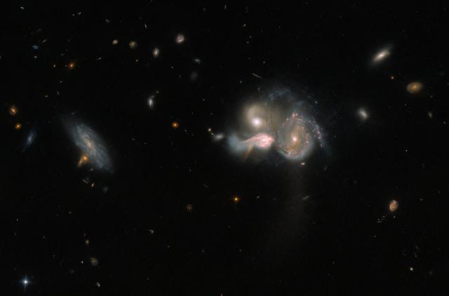 This Hubble Space Telescope image holds three galaxies set on a collision course. They will eventually merge into a single larger galaxy, distorting one another’s spiral structure through mutual gravitational interaction in the process.Andrea Gianopoulos (NASA)
