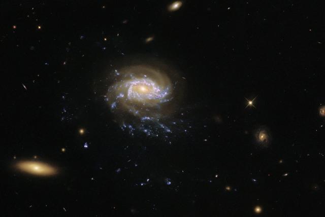 This #HubbleFriday image includes a cluster near the center that appears to be "stretching" nearby galaxies.