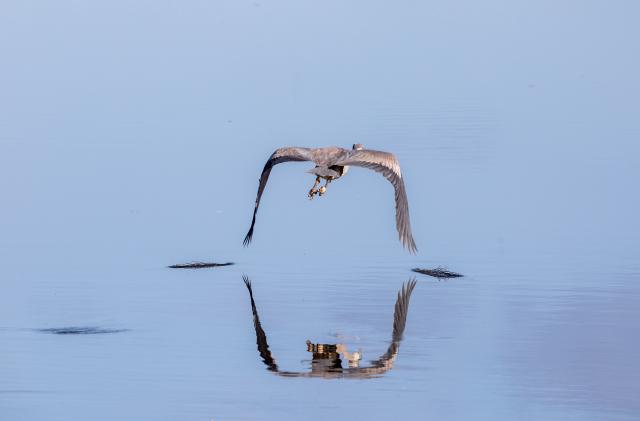 A Great Blue Heron skims its wings on a waterway at NASA's Kennedy Space Center in Florida on Jan. 11, 2021, making an artistic reflection on the water’sNASA