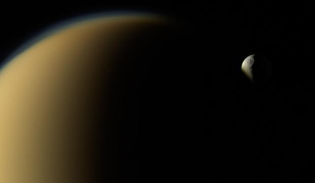 Saturn’s moon Tethys disappears behind Titan as observed by Cassini on Nov. 26, 2009.NASA Solar System Exploration