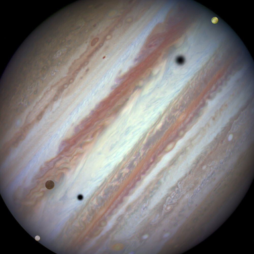 This image shows three of Jupiter’s dozens of moons – and two of their shadows – moving across the planet in 2015: go.nasa.gov/3HTQJWg