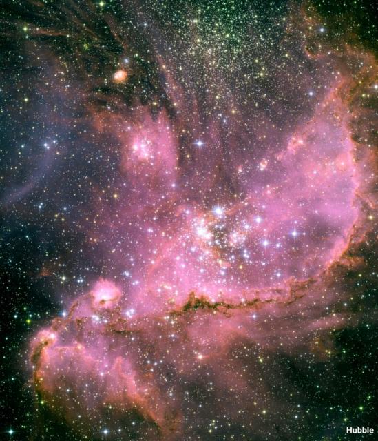 This #HubbleClassic image shows a sea of glowing hydrogen gas, along with small amounts of other elements such as oxygen and sulfur.