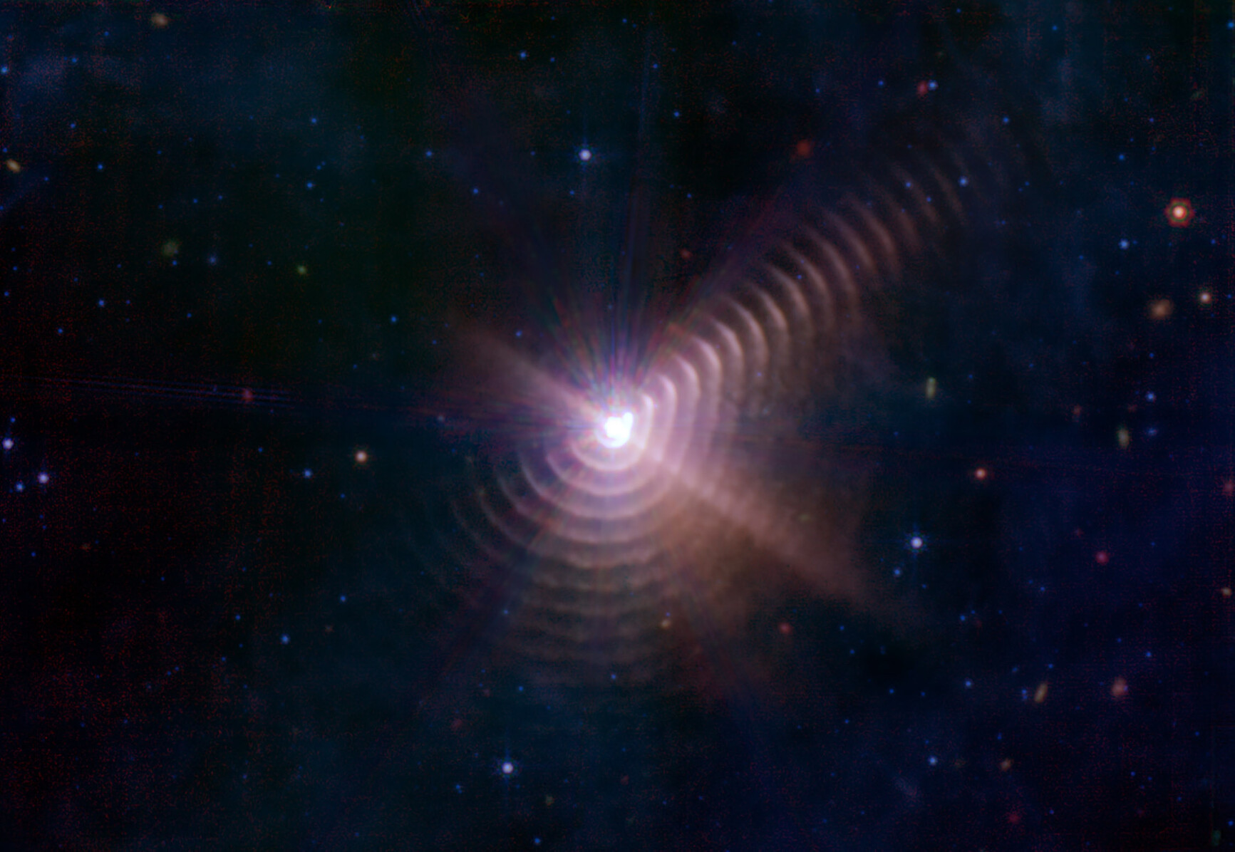 A new image shows at least 17 dust rings created by a rare type of star and its companion locked in a celestial dance.Tony Greicius (NASA)