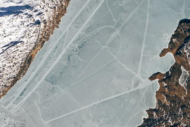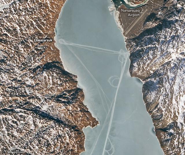 Paths that cut across the still-frozen Tunulliarfik Fjord in southern Greenland were likely made by people.go.nasa.gov