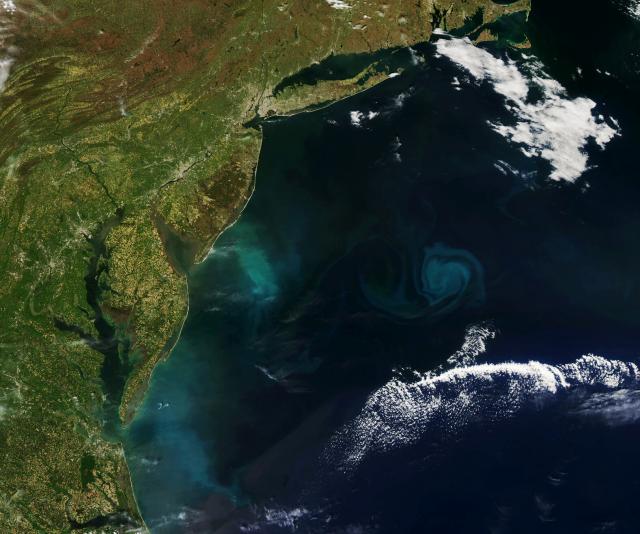 NASA’s Aqua satellite watched the U.S. Mid-Atlantic coast dazzle with swirls of green and turquoise, in part from a phytoplankton bloom. Though phytoplankton are microscopic, large groups of them are visible from space. go.nasa.gov/3ngVyBJ