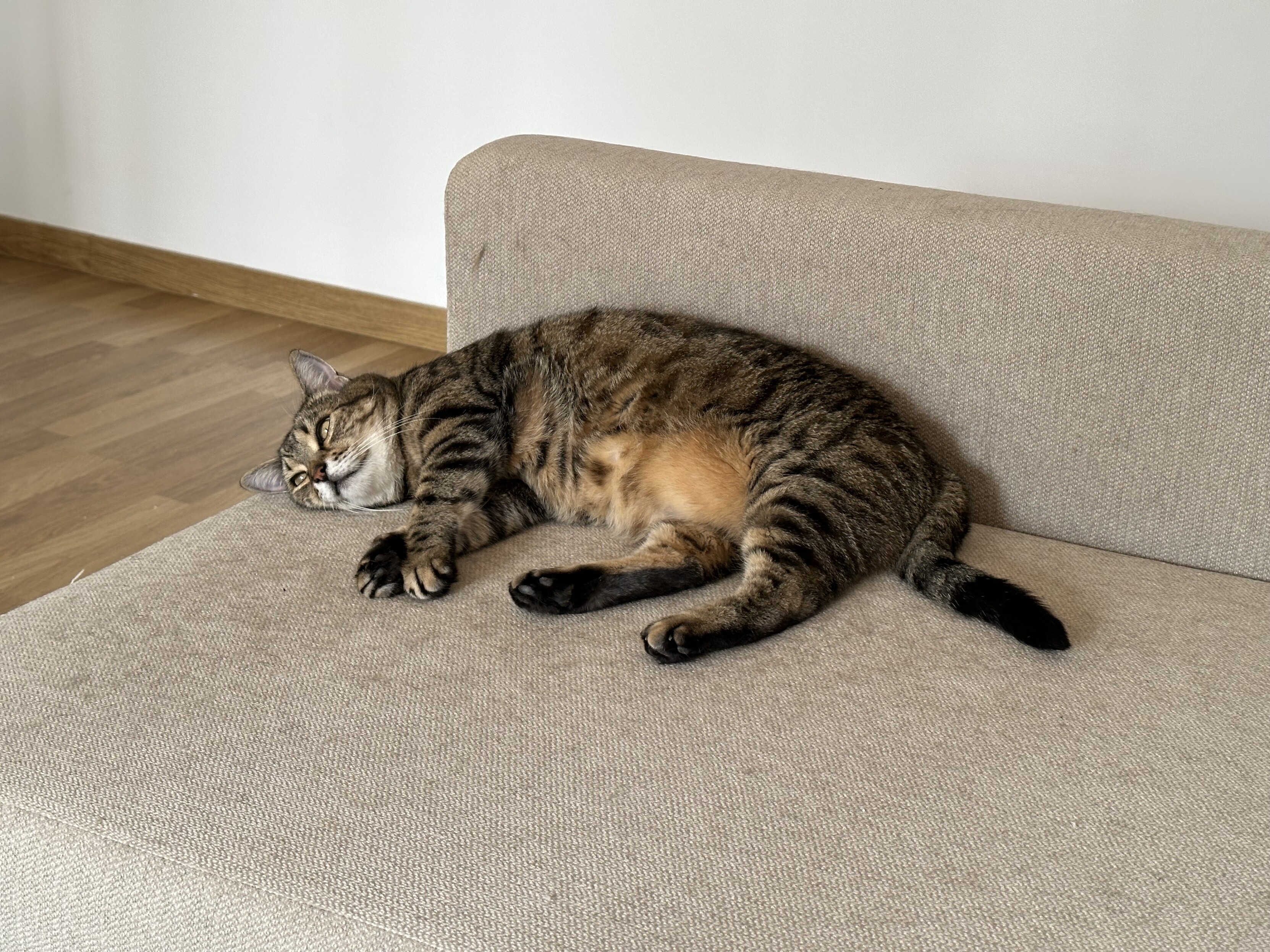 It's hot again, so my boy Pörri is doing his best impression of a decadent Roman emperor leaning over his cups - that is to say, napping while using his water bowl as a pillow, and occasionally flicking his little tongue out to have a leisurely few sips of water. Sometimes he falls asleep like this.