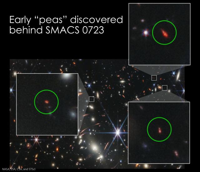 In @NASAWebb's very fist image, scientists have now identified three of the earliest galaxies, and they resemble a rare type in our cosmic neighborhood: Green pea galaxies. go.nasa.gov/3GPdQB2