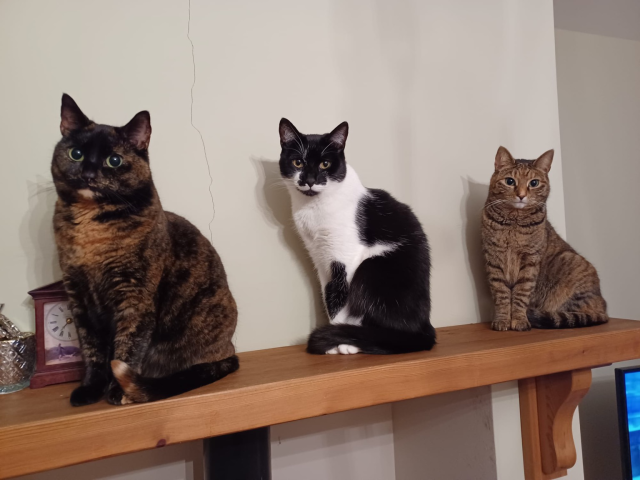 The boys clumped up on my lap again. Even one of them is quite hefty, all three at once is a lot of cat.