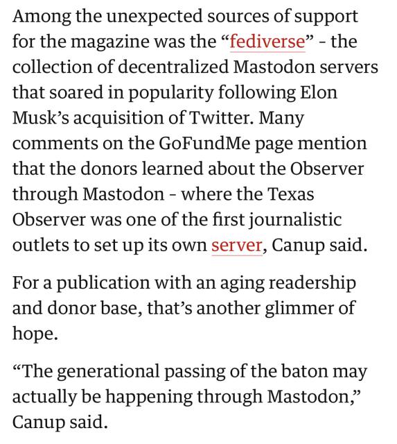 “Among the unexpected sources of support for the magazine was the #fediverse—the collection of decentralized Mastodon servers that soared in popularity following Elon Musk’s acquisition of Twitter. Many comments on the GoFundMe page mention that the donors learned about the Observer through #Mastodon—where the Texas Observer was one of the first journalistic outlets to set up its own server, @jamescanup said.”