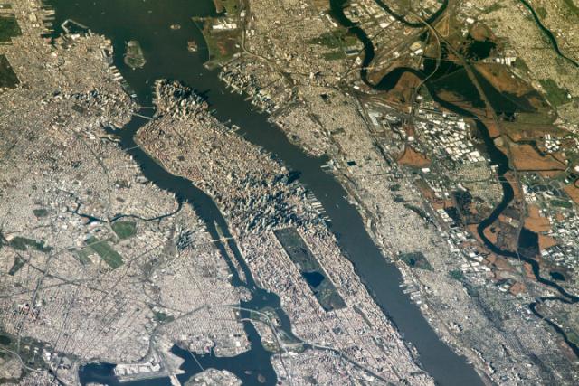 Shadows from skyscrapers and other city buildings give the photograph a 3D look.go.nasa.gov