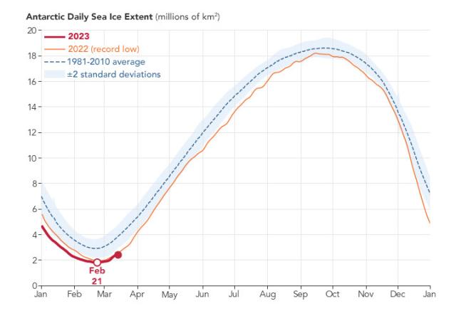 Sea ice around Antarctica reached its lowest extent on Feb. 21, 2023, at 1.79 million square kilometers (691,000 square miles).