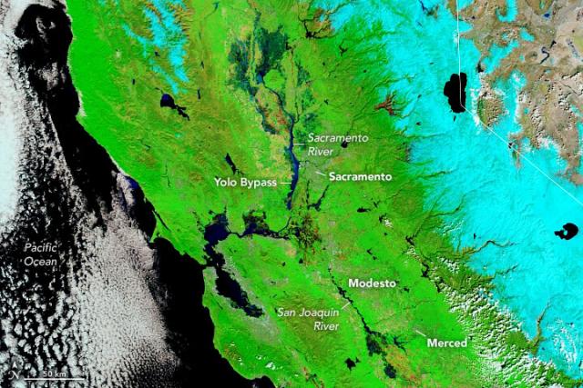 Two successive atmospheric rivers hit California this month, bringing rain, snow, and strong winds. On March 16, NASA’s Terra satellite acquired this false-color image where snow is light blue, water dark blue, and vegetation green.