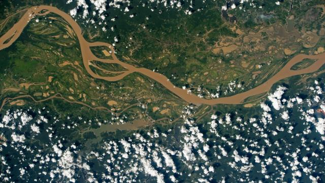 An astronaut aboard the @Space_Station took this photo of the lower Amazon River in Brazil, which carries a huge amount of sediment and occasionally delivers muddy water to nearby lakes.