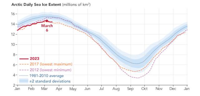 Arctic update: On March 6, 2023, Arctic sea ice appeared to reach its annual maximum extent (or coverage) at 14.62 million square kilometers (5.64 million square miles) – the fifth lowest in the satellite record maintained by the @NSIDC.