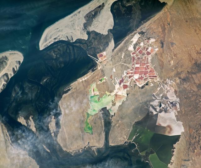 The coastal lagoon has many evaporation ponds that are used to produce salt. go.nasa.gov/409kidq