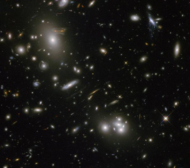 The massive gravitational field of Abell 68 is strong enough to bend the light paths of more distant galaxies, causing the warped shapes of some galaxies seen here: go.nasa.gov/442N3e1