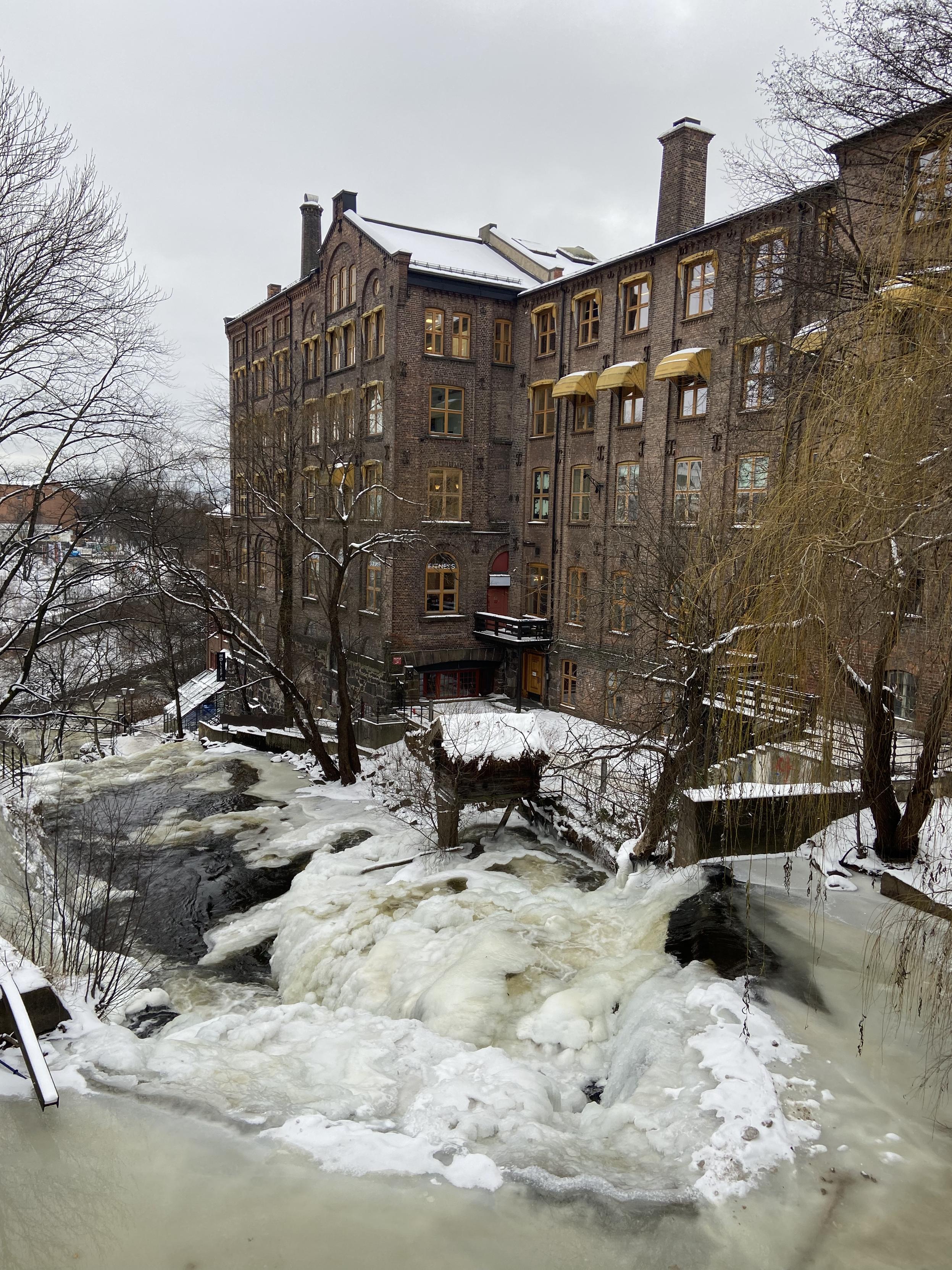 Us: historic brick building by a frozen waterfall in the middle of #Oslo