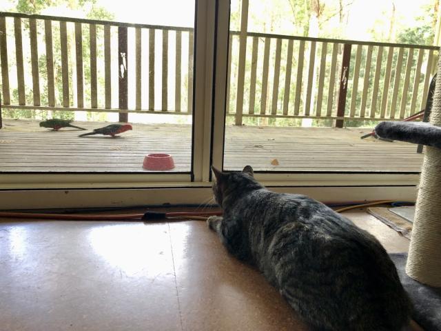 #CatTV is on. The #KingParrot couple had come for seed and we have Pepsรฌ visiting. Heโs intently watching the birds.