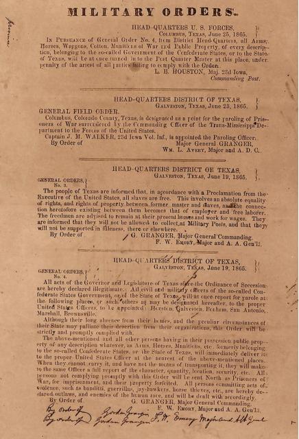 In Texas, slavery continued as the state experienced no large-scale fighting or significant presence of Union troops. Many enslavers outside the Lone Star State moved there, as they viewed it as a safe haven for slavery. After the war ended in the spring of 1865, General Granger’s arrival in Galveston that June signaled freedom for Texas’ 250,000 enslaved people and later solidified by the 13th Amendment.