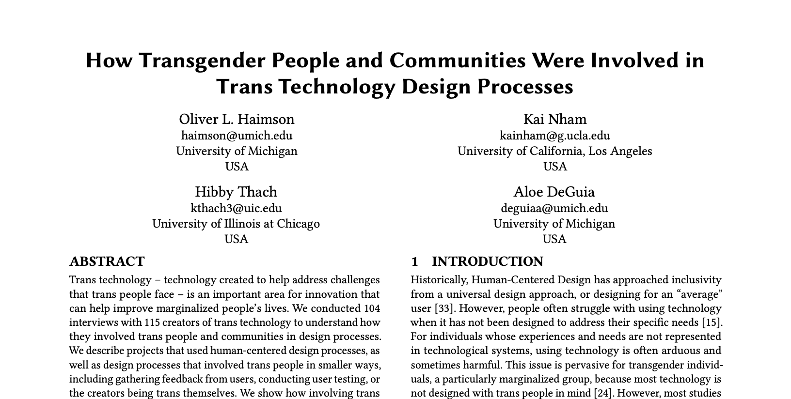 Excited to share the preprint of our new #CHI2023 paper w/ Kai Nham, Hibby Thach, & Aloe DeGuia. We show how involving trans people in design processes is vital for trans tech to realize its potential to address trans needs 🏳️⚧️ oliverhaimson.com/PDFs/Haimson…