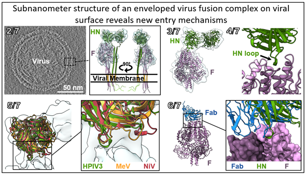 The fusion/entry complex of an enveloped virus in situ on the virus surface by cryo-ET at subnanometer resolution. Our new paper shows new interactions that reveal paramyxovirus entry mechanisms. www.science.org/doi/10.1126/sciadv.ade2727 Twitter link: bit.ly/3RPiHpz