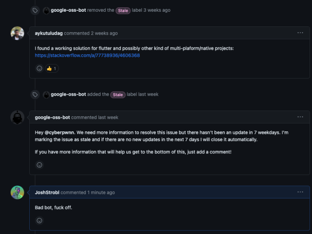 If you are a developer that uses these to automatically close issues that have been valid for months and conveniently rely on a response from ONE person in an ocean of other responses, please reconsider your life choices. If there were no other responses? Fine. That's on the person to reply. But the bot should immediately eject itself from the conversation the moment someone else chimes in. Closing issues like this seriously hurts discoverability for developers and users alike.