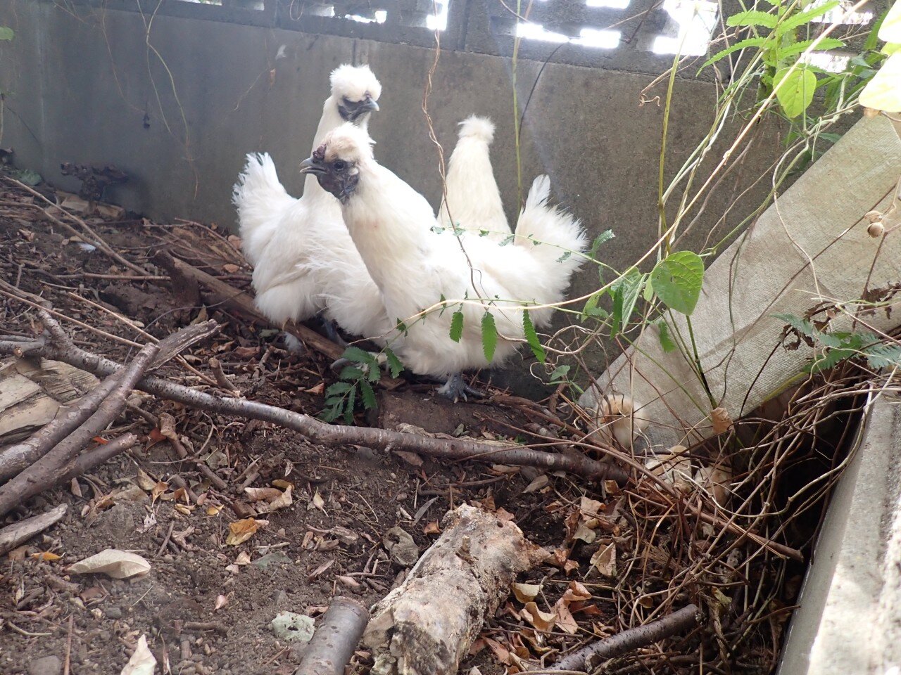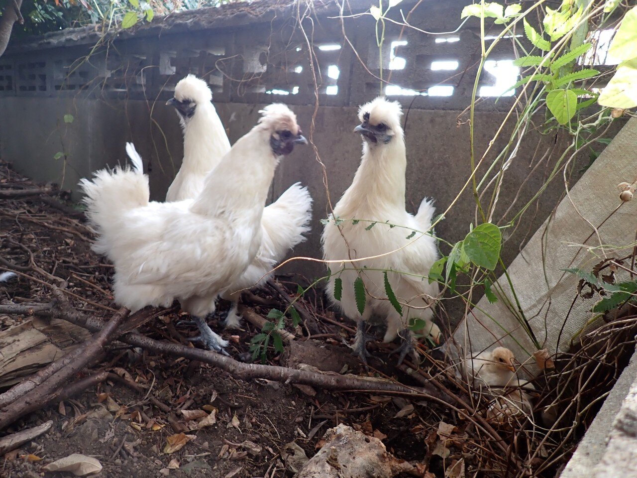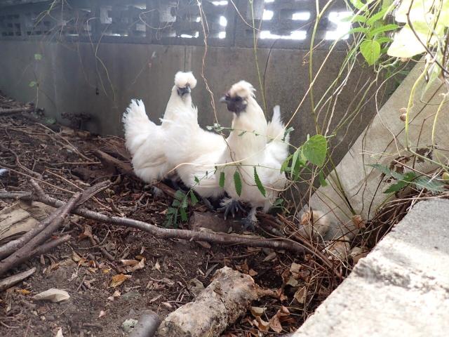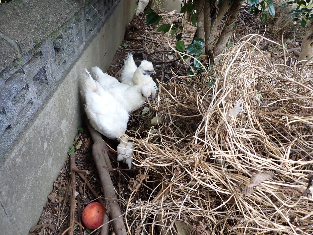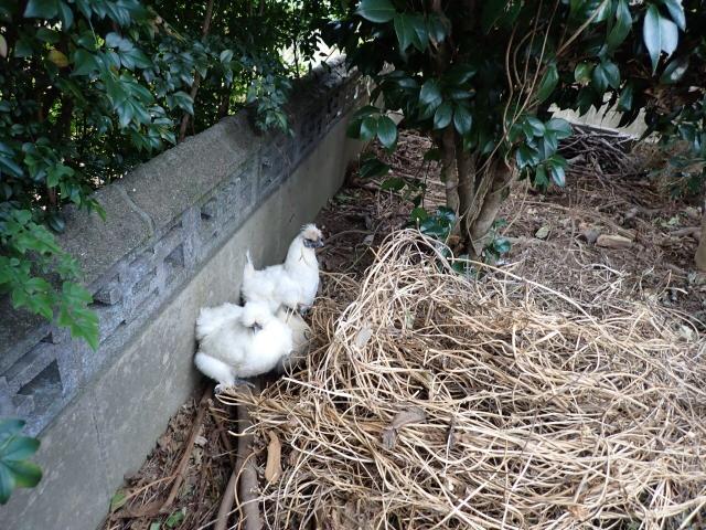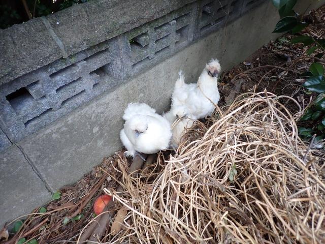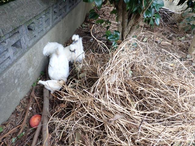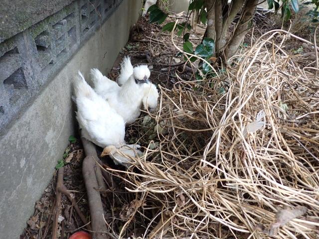 The Miyazaki Jidori fighting birds seem half-wild compared the silkies. They disappear into piles of brush, or flatten themselves under fallen branches.. fascinating..