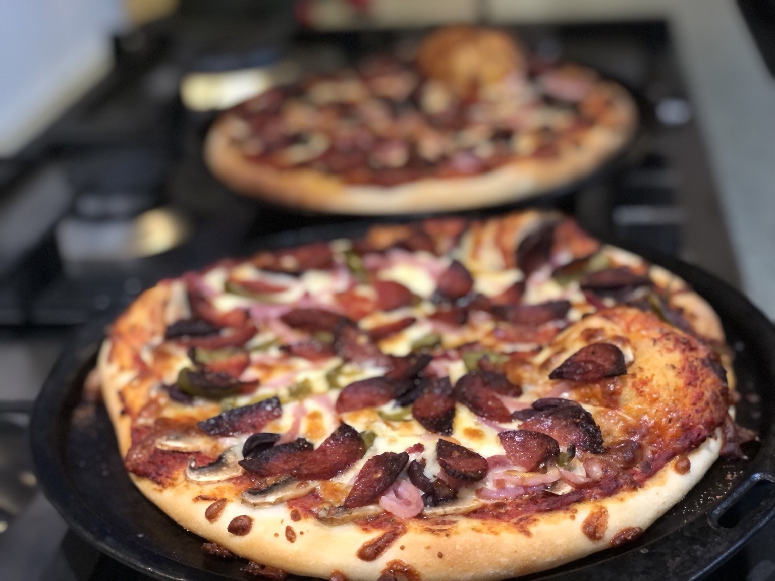 Potato, onion, parmesan, rosemary & olive oil on one, the other was a tomato, garlic, oregano & basil base, topped with mushroom, onion, capers, cheese, bacon & salami.