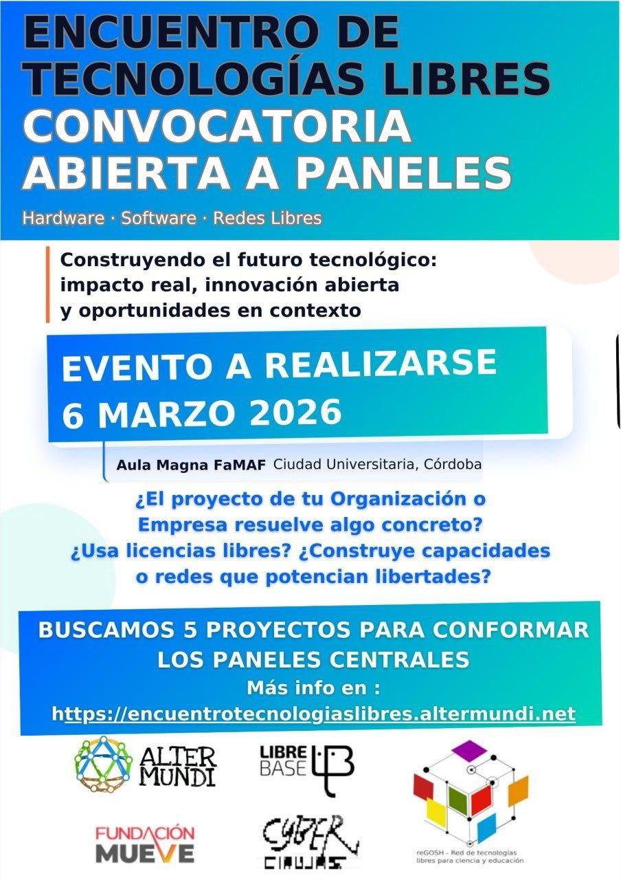 Se buscan 5 proyectos de #SoftwareLibre y #HardwareLibre que construyan el futuro tecnológico: impacto real, innovación abierta y oportunidades en contexto para ser presentados en el Encuentro de Tecnologías Libres en Córdoba.