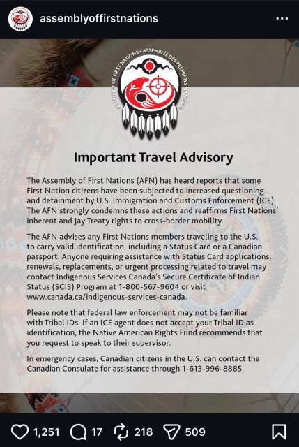 Attached: 1 image The Assembly of First Nations in Canada has issued a travel advisory for the United States after reports that Indigenous people are being increasingly questioned and detained by #ICE. #FirstNations #TravelAdvisory #USTodon.eu