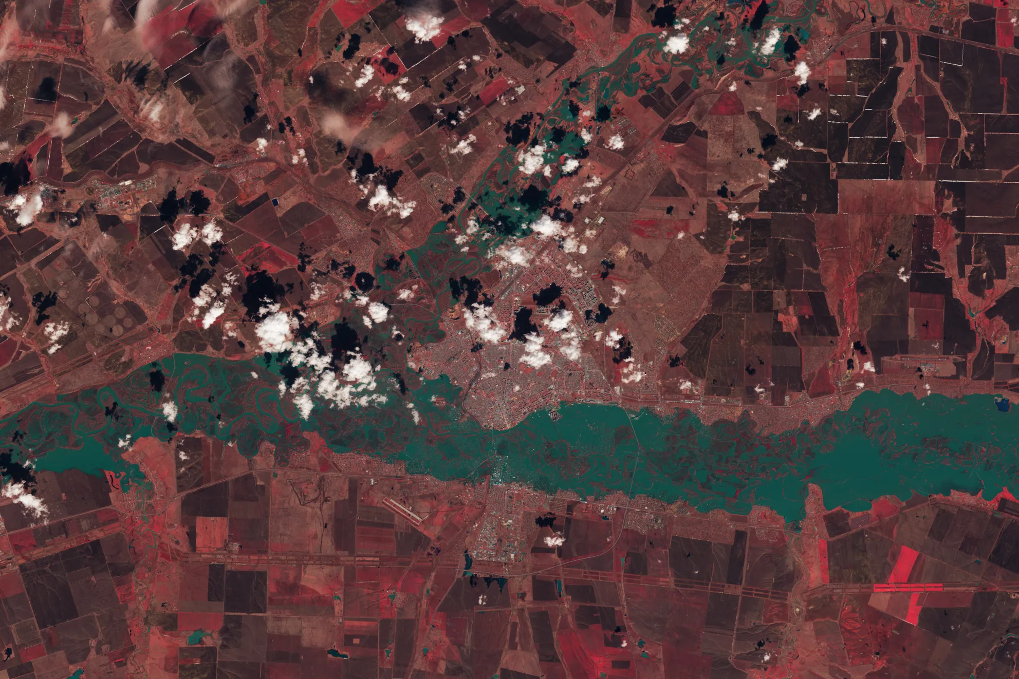Ural River levels peak in this April 13, 2024, enhanced color image from Landsat 9; here, vegetation appears red, while water is blue-green. After heavy rainNASA