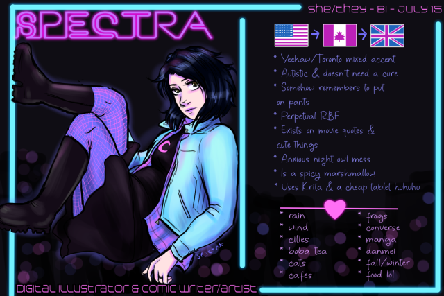 I'm Spectra, solo creator of the webcomic Latera. Polyam romance, drama, and a mirror realm? YEH BOI! β¨