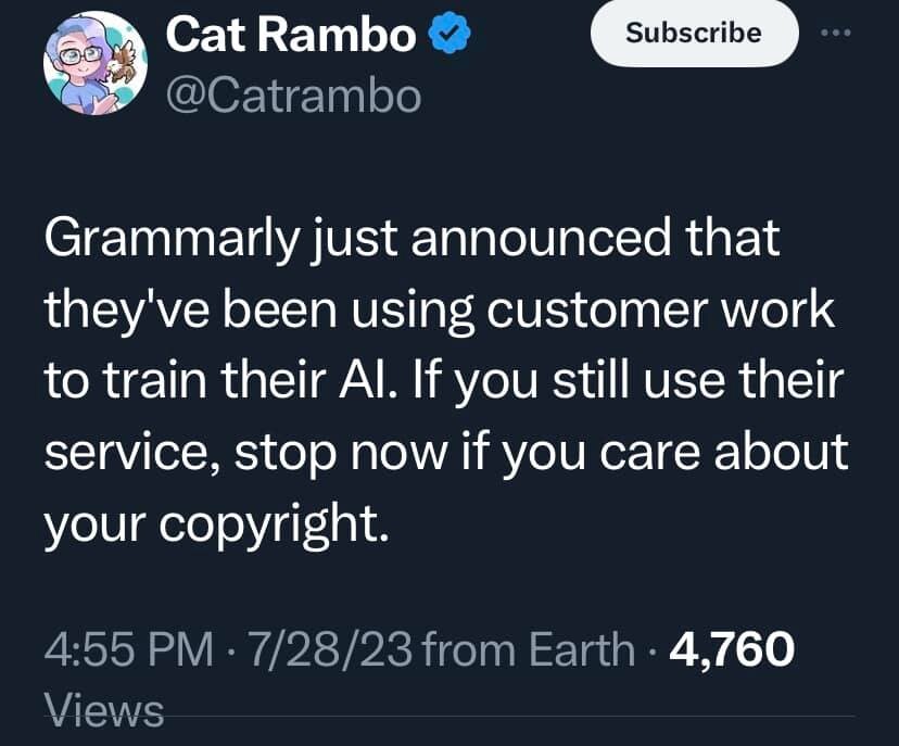 Back in Feb, when Grammarly said they were going to think about incorporating AI, I immediately canceled my account and uninstalled. And now they've actually done it.