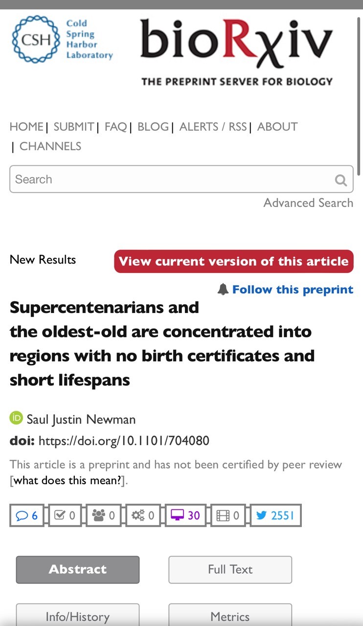 The observation of individuals attaining remarkable ages, and their concentration into geographic sub-regions or ‘blue zones’, has generated considerable scientific interest.bioRxiv