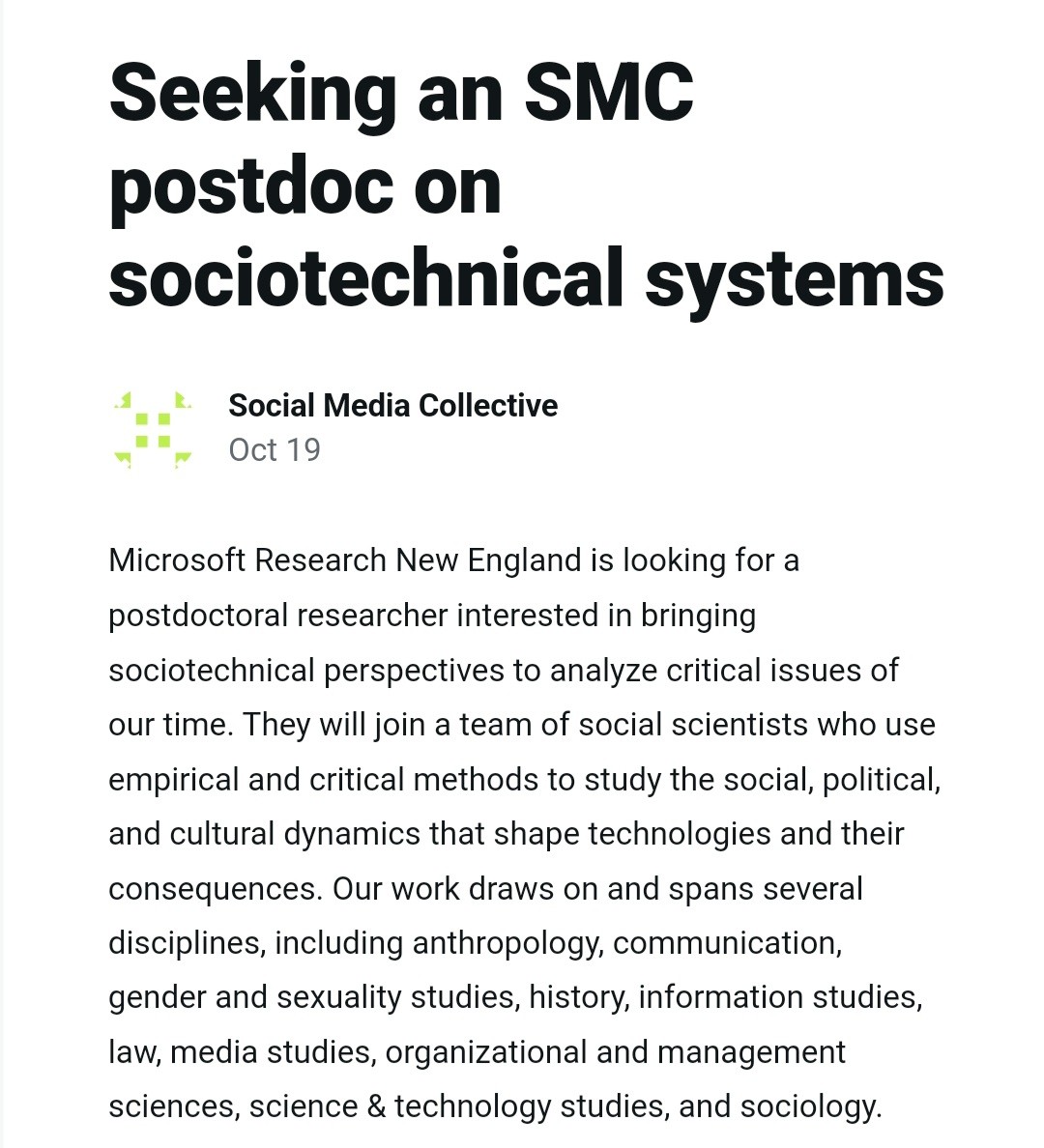 Hot off the press!!!! 🔥 Come work with @nancybaym @tarleton @zephoria & Mary Gray (and me!) at Microsoft's Social Media Collective, it's a great postdoc! Happy to field questions from anyone interested in applying ✨️ #aoir2023