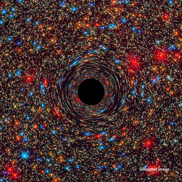 Most galaxies, like our Milky Way, have black holes at their centers. This computer-simulated image shows what that might look like. In the center is the black hole’s event horizon, where no light can escape.